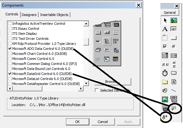 - Pilih komponen MS ADO Data Control 6.0 dan MS DataGrid Control 6.0,dan tekan OK